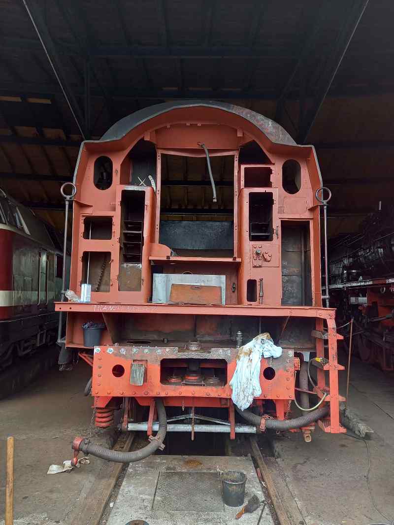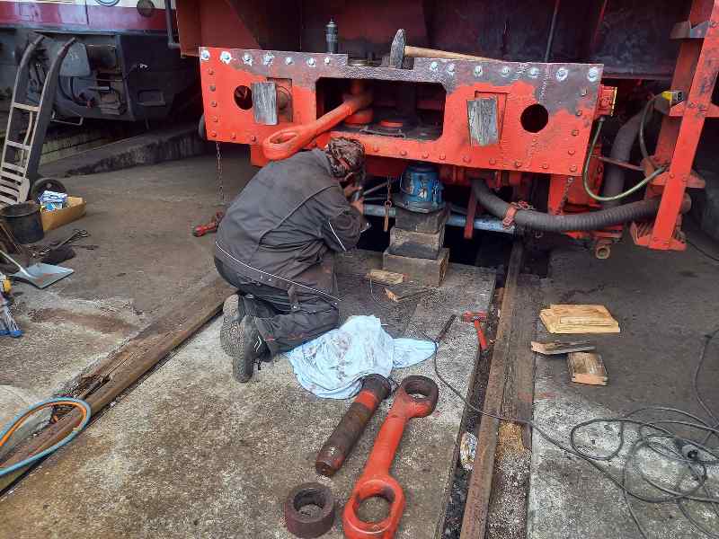 Last Saturday, some active people concentrated on the completion of the tender of our steam locomotive 50 3570. Here, especially the so-called coupling irons were to be examined, which connect the tender with the actual locomotive. These are a total of three approximately leg-thick metal rods that are attached to the tender and the locomotive. These had to be removed, inspected and repainted. This was a tough job because the bolts holding the coupler bars in the tender hadn't moved in years and were rusted solid accordingly. To loosen them, it took a lot of heat from the welding torch and more or less discreet blows with the sledgehammer. Finally, the coupling irons, each weighing around 100 kilograms, could be removed.
