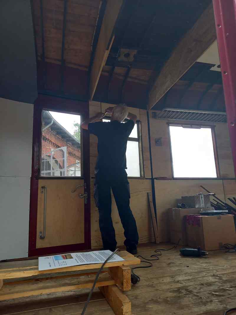 Work in the sidecar 197 805 was much quieter, but still busy. Here, the interior work on the walls continued.