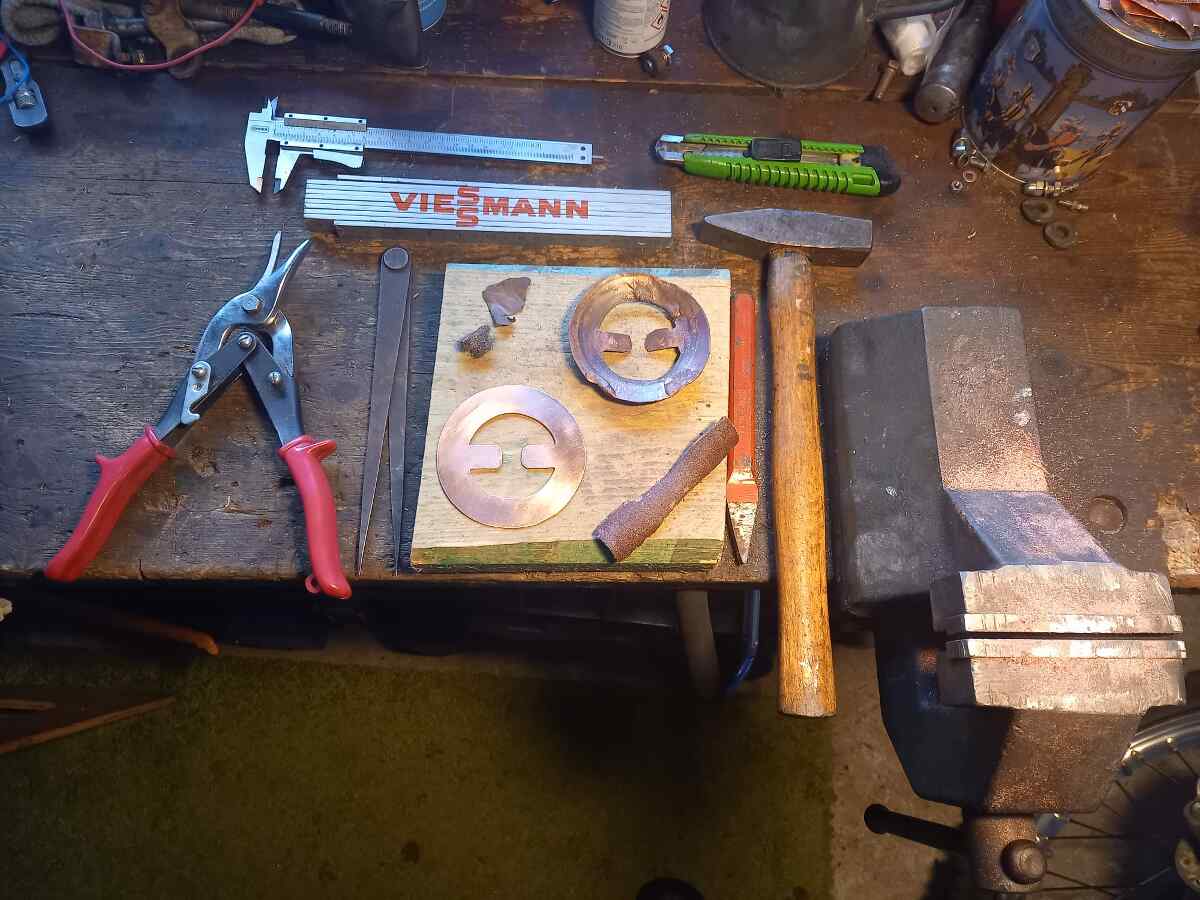 When the further examinations of the bogies and the brake system are completed, the locomotive will be put back on the bogies. We will report on this shortly. Also worth mentioning is the diligent home work of a colleague. He has made new gaskets for the boiler feed valves of the steam locomotive “Pritzwalk” in his home work. Here is a picture of an old and new copper gasket and his tools for making them.