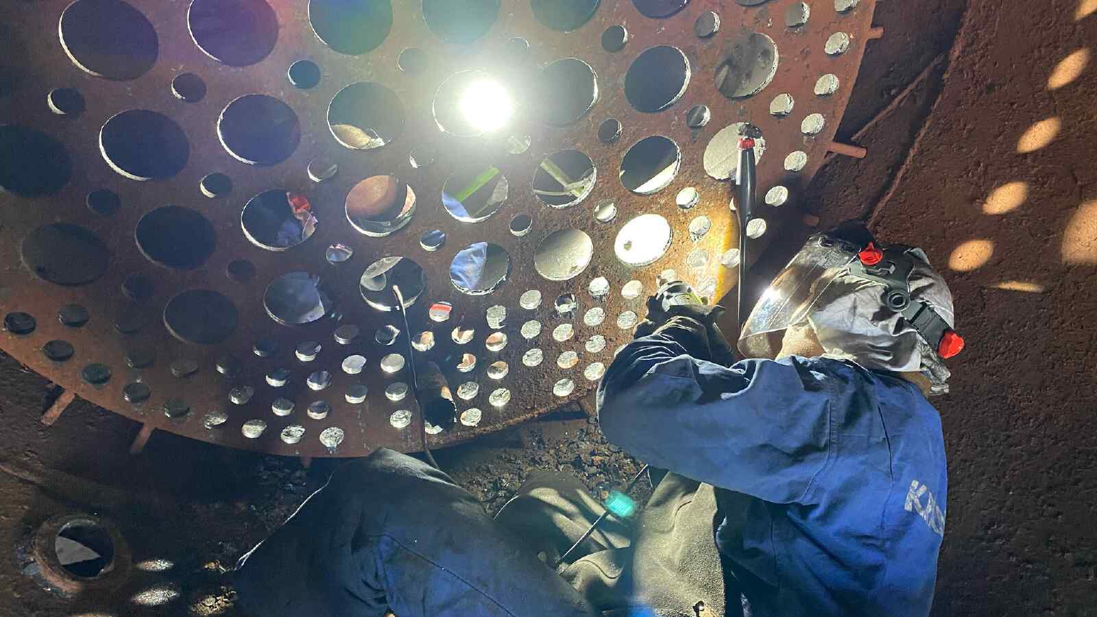 Our own steam locomotive 50 3570 is still ‘undergoing treatment’. As we have already reported, all the tubes have been removed from the boiler so that they can be replaced with new ones. In the meantime, the boiler overhaul has made further progress. Here the pipe walls have been ground. These are the metal walls in the boiler between which the pipes run. The openings that accommodate the pipes must actually be circular so that the new pipes can actually be installed pressure-tight.