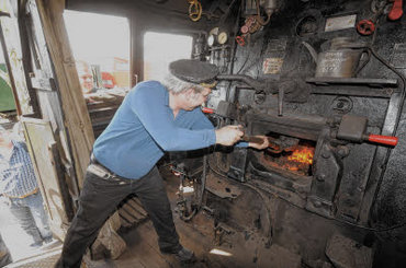 Heizer Gernot Gattermann schippt in der großen Dampflok vor der nächsten Fahrt Kohlen nach. |