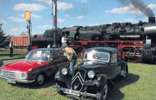 Oldtimer unter sich: Ein DKW F102 und ein Citroen 11CV BL waren am Wochenende am Lokschuppen ebenso zu sehen wie die "Schwarze Lady", die zu Mitfahrten im Führerstand einlud. Foto: Torsten Adam. |