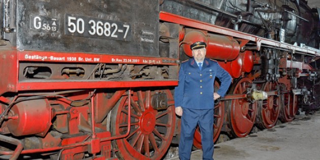 Stadtführer Jürgen Schmidt in seiner neuesten Rolle: Stilecht als Eisenbahner wird er die Besucher zu den Dampfrössern führen. Foto: Gerhard Baack |